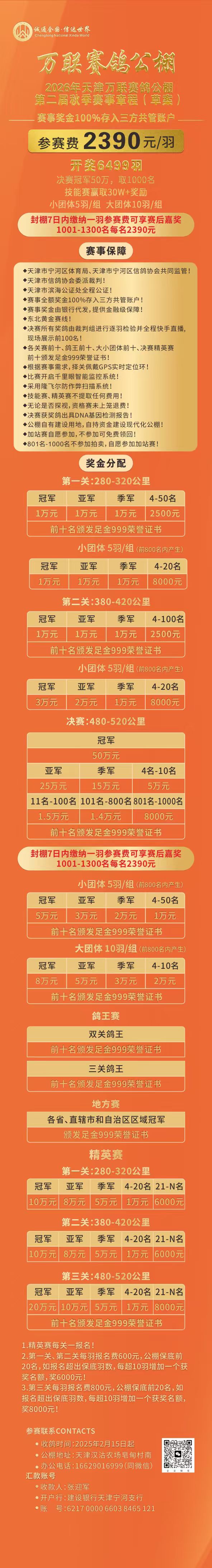 3、奖金兑现承诺:赛事奖金100%存入三方共管账户,赛事奖金由公证处、银行、信鸽协会三方直接发放,赛事奖金关关极速发放。