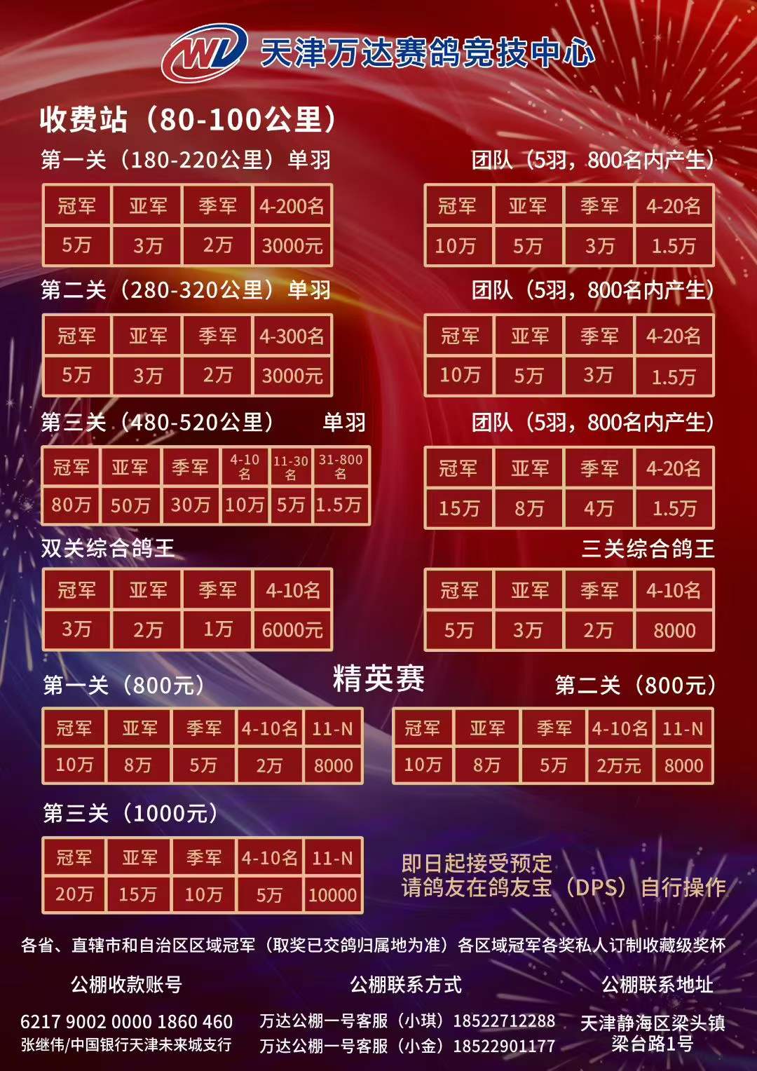 - 公棚地址:天津市静海区梁头镇万达赛鸽竞技中心
