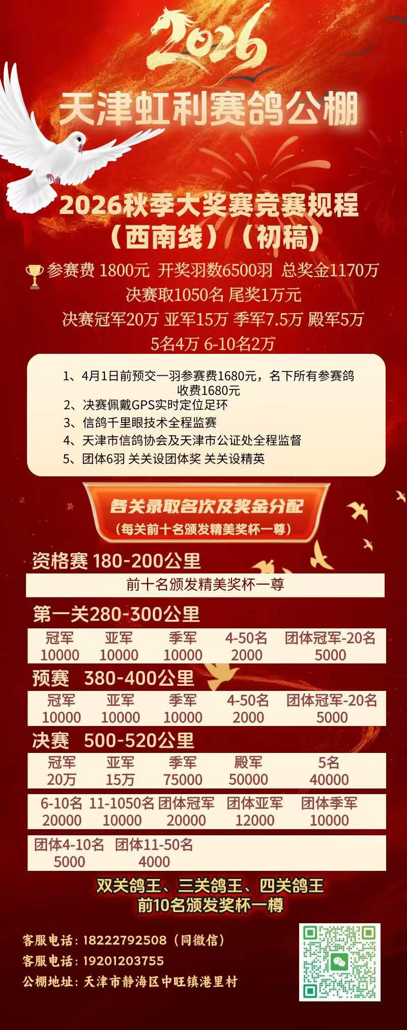 一、基本概况天津市静海区虹利赛鸽公棚位于天津市静海区蔡中路894车站,由中国信鸽协会监管。该公棚以国际、国内先进、科学合理的设计方案进行建设,采用一体化钢架结构,公棚长200米,宽28米,高15米,可容纳20000多羽赛鸽。从配件设施到饲养团队,均达到业内领先水平,为广大鸽友创造一个心神向往的赛鸽净地。