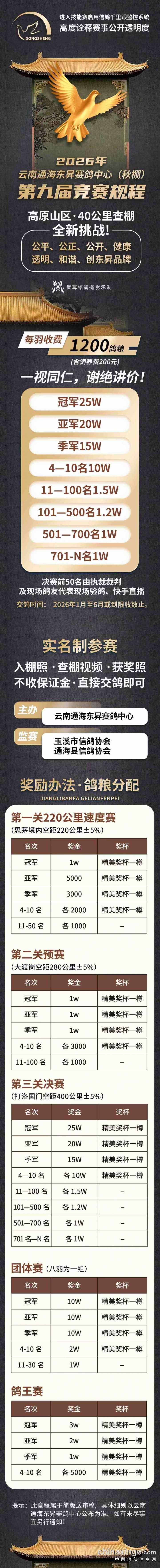 一、基本概况云南通海东昇赛鸽中心位于云南省玉溪市通海县,由中国信鸽协会监管。该公棚以国际、国内先进、科学合理的设计方案进行建设,采用一体化钢架结构,公棚长200米,宽28米,高15米,可容纳20000多羽赛鸽。从配件设施到饲养团队,均达到业内领先水平,为广大鸽友创造一个心神向往的赛鸽净地。