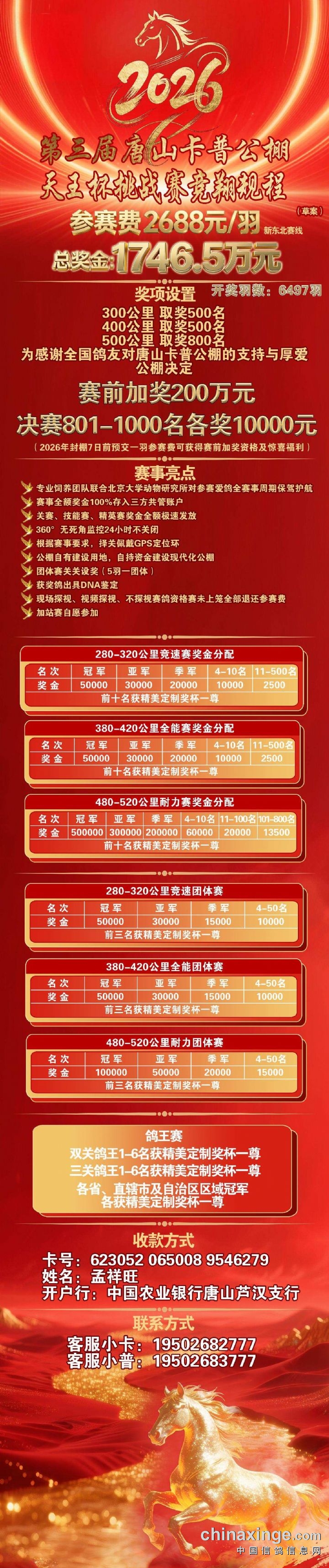 唐山卡普赛鸽公棚坐落于唐山市芦台经济开发区,泗水环绕,占地101亩,棚长303米,宽32米,高18米独创智能绿色呼吸系统设计,采光良好,设有:幼鸽观察室、化验室、处置室等为每羽赛鸽创造更健康的生态空间。在卡普精英团队带领下一如既往地遵循“以诚交天下友,以信迎四方客”这一宗旨,始终如一地本着“公开、公平、公正”这一原则组织比赛,为鸽友提供专业、透明、360°诚信保障:用更好的服务和成绩来报答各界友人对卡普的厚爱!