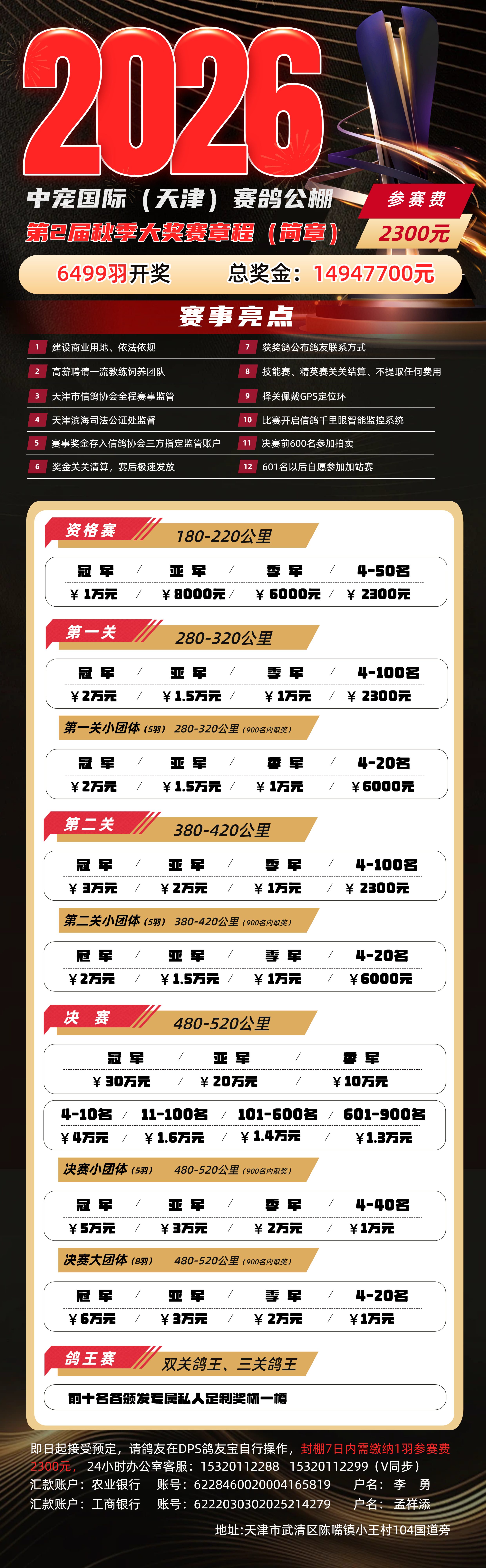 赛鸽公棚更是备受瞩目。公棚建筑气势恢宏,长288米、宽30.5米、高19米,具备完善的设施和科学的设计,为赛鸽提供了优越的栖息与竞赛环境。目前,中宠国际赛鸽公棚已开启首届秋赛,凭借其专业的赛事组织和优质的服务,吸引了众多赛鸽爱好者的积极参与,致力于打造成为赛鸽行业的标杆赛事。未来,中宠国际(天津)赛鸽公棚将继续秉持创新、专业、责任的理念,不断拓展业务领域,提升产业竞争力,为推动赛鸽产业的繁荣发展贡献力量。