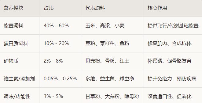 训飞/比赛期:提升能量密度(玉米占比提至40% + 小麦20%),添加刺五加粉(抗疲劳)、蜂花粉(快速补能);