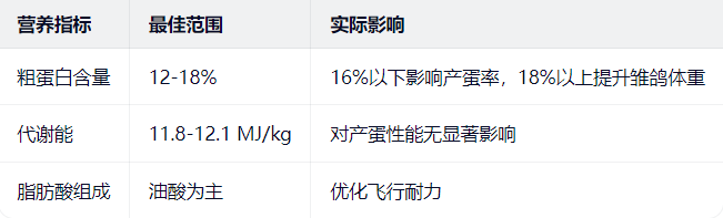 与家禽不同,鸽子的营养需求具有独特性,直接套用鸡鸭营养标准会导致性能下降。研究显示: