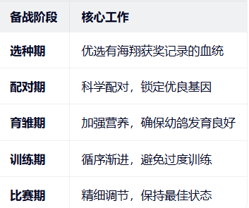 温馨提示:每个鸽舍的情况不同,鸽友们应根据自身条件灵活调整,切勿生搬硬套。海翔路上,愿各位鸽友都能取得理想的成绩!