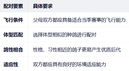近亲配法:对于品质优秀的种鸽,可采用1/4至1/2的近亲配对方式,这样有助于锁定优良基因,使优质性状稳定遗传给后代。